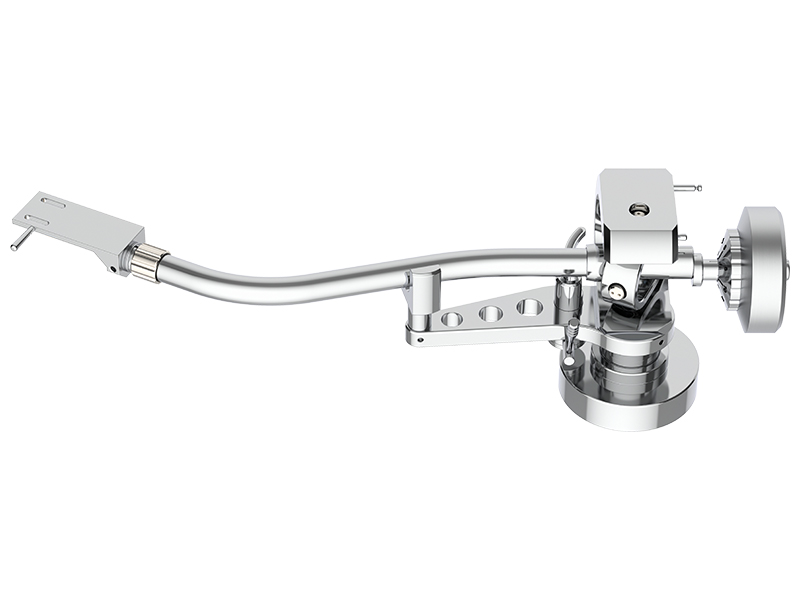 Braccio a S in alluminio da 10″ con shell in alluminio e attacco SME. Cavi interni in rame purissimo. Cuscinetti di altissima precisione a struttura invertita e ad alta massa ABEC 7, su 4 punti per snodo cardanico del braccio. Blocco dei cuscinetti in alluminio. Contrappeso smorzato TPE. Regolazione Azimuth e VTA. Ferma-braccio lavorato CNC. Connettore d’uscita DIN a 5-pin d’orati. Versione con particolari in alluminio lucidati a mano.